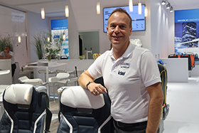 Heiko Krahn, Leiter Vertrieb Bussitze, erläutert am Stand, wie die neuen Modelle von M1 bis M3 für Kleinbusse ab 8 Sitzplätzen jetzt in einer Designlinie zu sehen sind.