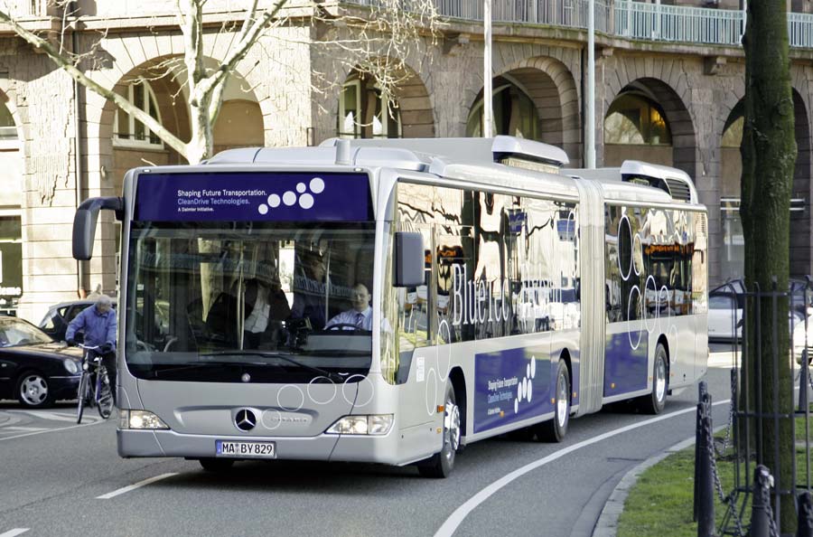 Mercedes-Benz Omnibusse hat heute seinen ersten serienreifen Hybrid-Stadtbus auf Basis des Citaro Gelenkbusses im Mannheimer Werk Fachjournalisten aus ganz Europa vorgestellt. Der im Herbst 2007 erstmals präsentierte Citaro G Blue Tec Hybrid hat seine eineinhalbjähriger Probephase mit jetzt abschließendem Polartest bestanden und wird ab Herbst 2009 ausgeliefert, wobei Rotterdam mit zwei Bussen den Anfang macht. Michael Göpfarth, Geschäftsführer von Mercedes-Benz Omnibusse, bezeichnete seine „jüngste Tochter“ als eine „wichtige Zwischenstufe zum Zero-Emission Fahrzeug“, dem Brennstoffzellen-Bus. Beim Hybrid-Citaro, der ganz bewusst im Sinne der Fahrer kaum Änderungen zum gewohnten Diesel-Citaro mit sich bringt, arbeitet der Dieselmotor nicht als ständiges Antriebsaggregat, sondern dient als Generatorantrieb zur bedarfsweise Stromerzeugung, der in einer Lithium-Ionen Batterie auf dem Busdach gespeichert wird. Mit dieser Energie werden vier elektrische Radnabenmotoren gespeist, die an der Mittel- und Hinterachse den eigentlichen Antrieb übernehmen. Der Vorteil des seriellen Antriebes: Der Hybrid-Citaro kann bis zu 3 km am Stück elektrisch betrieben und damit an Haltestellen oder in der Innenstadt emissionsfrei fahren. „Dadurch werden 20 bis 30% Dieselkraftstoff eingespart“, wie Entwicklungsleiter Richard Averbeck versicherte. Erster Fahreindruck: Trotz Mehrgewicht enorm spritzig.