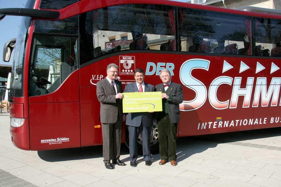 Seit über einem halben Jahr unterstützt Sigmar Gabriel das umweltfreundlichste Verkehrsmittel mit dem Appell „Fahren Sie Bus!“. Heute zog der Bundesumweltminister in Wolfenbüttel eine positive Zwischenbilanz seiner Kampagne, die er im Sommer gemeinsam mit dem Internationalen Bustouristik Verband RDA und der Gütegemeinschaft Buskomfort (gbk) gestartet hat: „Die Botschaft auf dem grünen Ökosiegel kommt beim Verbraucher an.“ Ob als kleiner Aufdruck auf Briefköpfen, als Aufschrift auf Flaschenöffnern und Taschenspiegeln oder als große Folie an der Karosserie von Reisebussen: Der grüne Aufkleber mit dem Slogan „Der Bundesumweltminister empfiehlt: Fahren Sie Bus!“ wurde in den vergangenen Monaten bundesweit publik gemacht. Sigmar Gabriel freut sich, dass damit der Reisebus in der Klimadebatte in das Bewusstsein der Öffentlichkeit gerückt wird. „Denn der Reisebus erreicht sowohl in der Schadstoffbilanz als auch beim Spritverbrauch hervorragende Werte“, betonte der Umweltminister. Richardt Eberhardt bedankte sich beim Minister für die Unterstützung der Busbranche. „Durch diese Initiative wird deutlich, dass der Reisebus eine zentrale Rolle spielt, um auch in Zukunft die Mobilität des modernen Menschen auf umweltfreundliche Weise zu garantieren“, stellte der RDA-Präsident fest. Dabei stützt er sich auch auf die jüngste Studie des renommierten ifeu-Instituts, die erneut belegt, dass der Reisebus in der Ökobilanz nicht nur deutlich besser als Flugzeug und Pkw abschneidet, sondern gerade beim Klimaschutz auch weit vor der Bahn liegt. Rainer Klink betonte, dass durch die gemeinsame Aktion von Politik und Verbänden bereits positive Ergebnisse erzielt werden konnten. „Rund 30 Prozent der Touristen, die mit dem Reisebus in den Urlaub fahren, begründen diese Entscheidung auch damit, dass er ein umweltfreundliches Verkehrsmittel ist“, zitierte der gbk-Vorsitzende aus einer aktuellen Umfrage seines Verbandes. Und weil Busreisen ein gutes Preis-Leistungs-Verhältnis offerieren, wird diese Form des nachhaltigen Tourismus auch in Zeiten der Wirtschaftskrise gerne genutzt“, erklärte Klink. Damit der Reisebus seine Systemvorteile als umweltfreundliches Verkehrsmittel voll entfalten kann, plädieren sowohl RDA als auch gbk für eine generelle Befreiung von der Ökosteuer.