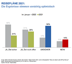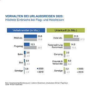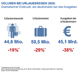 Die Corona-Pandemie hat der erfolgsverwöhnten Reisebranche zuvor unvorstellbare Rückgänge beschert: Für das Jahr 2020 wurden rund 20% weniger Urlaubsreisende erfasst, 30% weniger Urlaubsreisen, 40% weniger Gesamtausgaben bei Urlaubsreisen und 60% weniger Kurzurlaubsreisen als im Jahr zuvor. Die Entwicklung verlief dabei in verschiedenen Segmenten unterschiedlich: Die größten Rückgänge gab es bei Auslandsreisen (fast -50%), bei Pauschal- und Bausteinreisen (-50%) und Flugurlaubsreisen (fast -60%).