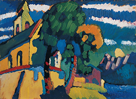 (Fotos: Mädchen mit Pfingstrosen von Alexej Jawlensky und die Riegsee-Dorfkirche – expressionistisch dargestellt von Wassily Kandinsky. c: Heydt-Museum Wuppertal )