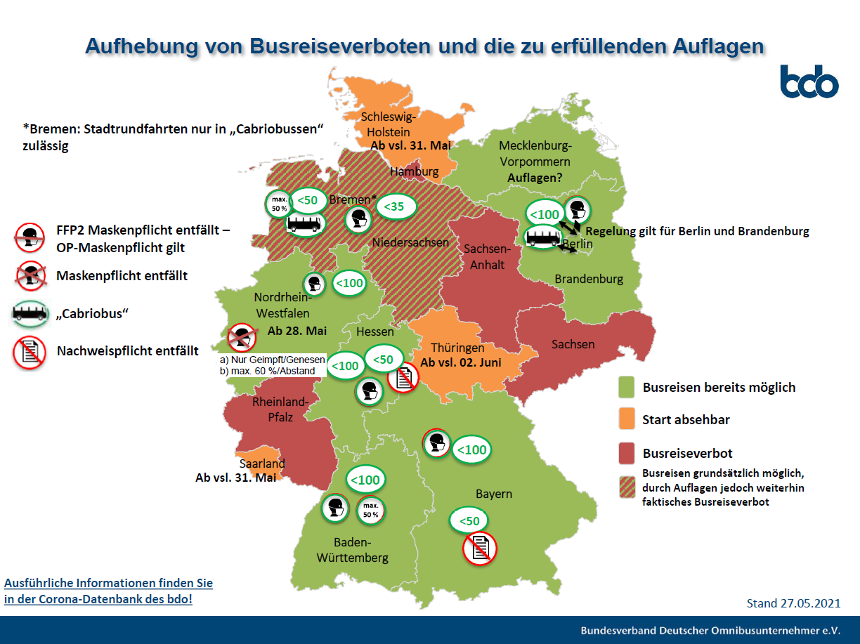 Aufgrund der chaotischen Situation in den Bundesländern (s. Graphik, © bdo) hat der Bundesverband Deutscher Omnibusunternehmer (bdo) in Berlin sein aktuelles Konzept für den verantwortungsvollen Restart der Reisebusbranche vorgelegt.