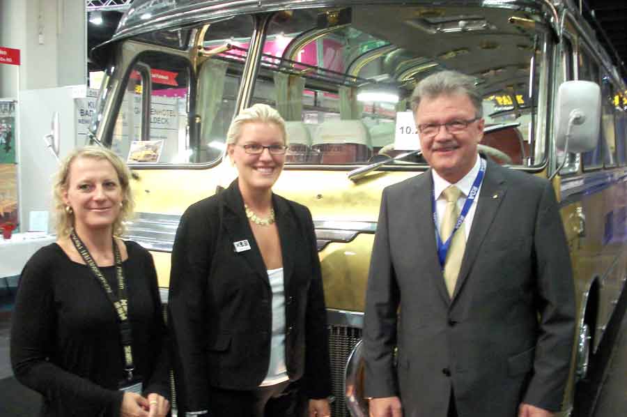 Mit einem 22 Karat vergoldeten Neoplan-Reisebus aus dem Jahr 1957 verblüffte die Schmuckwelten beim RDA Workshop so manchen neidvollen Busunternehmer: RDA Präsident Richard Eberhardt zeigte sich bei seinem Rundgang sehr angetan von diesem „Schmuckstück des Workshops“, das Nadine Heinig, Eventmanagement der Schmuckwelten, aus seiner Heimat Pforzheim mit nach Köln gebracht hatte. Der erste echt goldene Bus weltweit stammt aus dem Gottlob Auwärter Museum in Stuttgart ist in nur 9 Monaten gemeinsam mit Partnern 4.000 Feingoldplättchen überzogen worden. Das Fahrzeug ist darüber hinaus grundlegend restauriert worden und kann für Marketingzwecke und Eventfahrten gemietet werden. Der „Goldene Bus“ untermauert sichtbar die These, dass „Handwerk goldenen Boden“ habe – sei es im Karosseriebau wie auch bei der Schmuckherstellung in der „Goldstadt Pforzheim“. Kontakt über: Michael Buck, Geschäftsleitung Schmuckwelten. Tel: 0049 – (0) 7231 99 -4441