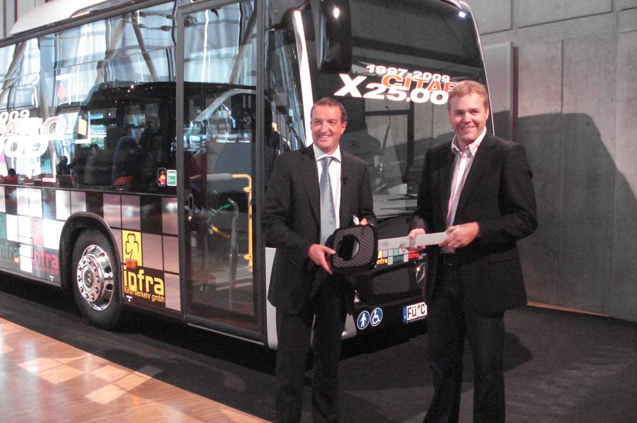 Ein denkwürdiges Ereignis für Daimler Buses: Im Rahmen der Preview zur Busmesse Busworld in Kortrijk übergab Michael Göpfarth (l.), Geschäftsführer Mercedes Benz Omnibusse, den 25.000sten Citaro aus Mannheimer Produktion an einen der ersten Citaro-Kunden, die infra fürth verkehr GmbH. Der damit „erfolgreichste Linienbus aller Zeiten“ wurde von Bereichsleiter Klaus Dierckgsweiler (r.) in Emfang genommen. Das bayerische Busunternehmen hat damit seinen 40sten Citaro im Fuhrpark und drei weitere bereits bestellt. Das Erfolgsgeheimnis des Citaro verriet Göpfarth wie folgt: „Das Baukastenprinzip erlaubt es unserer Entwicklung, den Citaro einer ständigen Frischekur zu unterziehen, ohne dass das eigentliche Konzept verändert werden muss.“