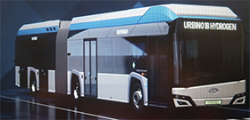 Der Urbino 18 hydrogen bietet Betreibern eine Kapazität von bis zu 138 Passagieren und eine Reichweite von durchschnittlich 350 km mit einer Ladung und einer Ladezeit von 20 Minuten. Auf dem Dach sind 8 Tanks montiert, die 51,2 kg H2 fassen, wobei die Sicherheit durch verschiedene Systeme absolut gewährleistet ist, wie bei der Präsentation mehrfach betont wurde. Als Ausstattung bringt der Brennstoffzellenbus Features wie die Elektro-Busse mit – etwa Mirror Eye Kamerasystem mit Mobileye Shield zum Schutz von Fußgängern, das solaris-eigene eS Connect System, mit dem die Busdaten aktuell digital ausgelesen und mitverfolgt werden können, ohne dass Ruhezeiten notwendig sind. Für die Passagiere gibt es in dem attraktiv und hell gestalteten Innenraum u.a. USB Points zum Aufladen von Handys etc.