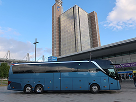 Auf der Pressekonferenz am Sonntagabend hat Daimler Buses die nächste Generation der Setra Reisebusse TopClass und ComfortClass (Fotos, c: lop) mit effizientem konventionellen Antriebsstrang vorgestellt. Der Setra Reisebus, der in Hannover vor dem Eingang zur Messe zu sehen ist, zeigt in Sachen Design das neue „Familiengesicht“. Mit serienmäßigem Active Brake Assist 5 und optionalem Active Drive Assist 2 Maßstäbe bei Sicherheits- und Assistenzsystemen wurden die neuen Setra weiter optimiert. Im Innenraum lassen neue Komfortausstattungen keine Wünsche offen.