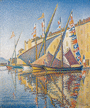 Während man in der Show „Monet – Rebell und Genie“ im Visiodrom den Spuren des „Vaters des Impressionismus“ folgt, geht es in der neuen Ausstellung im Von der Heydt-Museum um „Eine neue Kunst. Fotografie und Impressionismus“ (ab 4. Oktober). Im Visiodrom kann man physisch eintauchen in die Bildwelten Monets, im Von der Heydt-Museum dagegen lässt sich die malerische Meisterschaft Monets und seiner Weggefährten vor dem Original erleben. (Foto: Paul Signac, Segelboote im Hafen von Saint-Tropez, 1893, Von der Heydt-Museum Wuppertal)