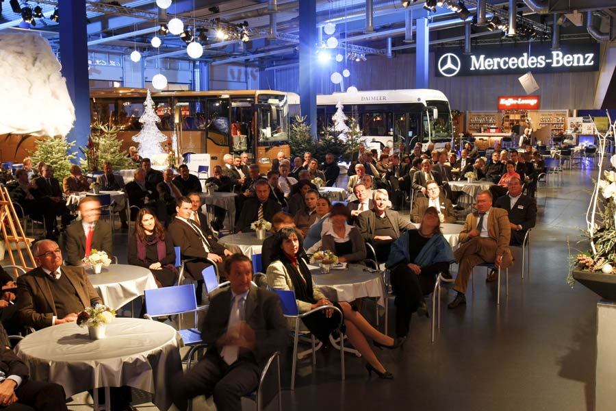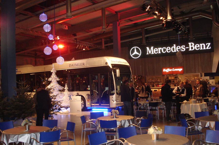 (lop) Die MOT 2009 ist eröffnet: Die Mercedes Benz Omnibustage werden an diesem und am kommenden Wochenende erwartungsgemäß rund 6.000 Einkäufer und Entscheider aus Busunternehmen und Verkehrsbetrieben aus ganz Europa in das MB-Omnibuswerk nach Mannheim bringen. Unter dem Motto „BUSiness & Christmas“ wird anhand der Bus-Exponate und der damit verbundenen Dienstleistungen des weltweiten Marktführers ein aktueller Überblick über die gesamte Bus-Palette geboten. Und dies alles in weihnachtlich stimmiger Atmosphäre mit vielen Touristik-Partnern als Aussteller „rund um den Bus“ in einem bewährten Gesamtpaket. Auf der Bus-Seite ist alles vorhanden, was Rang und Namen hat. Von Minibus-Varianten auf Sprinter-Basis über die Reisebus-Modelle – darunter der neue Tourismo in Hochboden-Version als Deutschland-Premiere – bis zu den Stadtbussen CapaCity, der nicht nur in Istanbul Furore macht, und dem „State of the Art“ Zukunftsbus Citaro Fuel Cell Hybrid. Die wirtschaftlich weiter verbesserte Hybrid-Version des Zero-Emission Citybusses wird nach der MOT direkt nach Hamburg zum Dauereinsatz fahren. Ein besonderes „Schmankerl“, das sich eigentlich zu Recht bald einen vorderen Platz im „Stern“-Museum verdient hat, ist der als „Kanzler-Bus“ berühmt gewordene schwarze O 303 in Diensten des Bobinger Busunternehmens Werner Ziegelmeier. Vor dem Mauerfall hatten hierin „Gorbi“ und Kanzler Helmut Kohl getagt, später auch Bill Clinton. In dem mit Konferenz-Faszilitäten – des damaligen Technikstandes -, mit Bordküche, bequemen Ledersitzen und Konferenz-Ecke ausgestatteten Bus, der im Vergleich zu den aktuellen „Stern“-Reisebussen doch bereits recht betagt wirkt, wurde deutsche Geschichte gemacht. Auch dies ein Grund, zur MOT zu kommen.