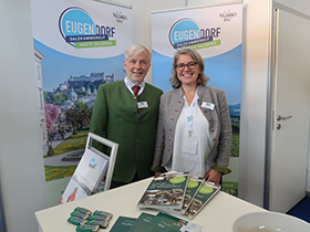 „Nach den tristen Monaten während der Corona-Zeit spüren wir jetzt eine regelrechte Aufbruchstimmung. Viele Busreiseveranstalter auch aus Deutschland rufen an und erkundigen sich nach Programmbausteinen für neue Busreisen“, freuen sich Bettina Schmidt (Geschäftsführung Tourismusverband Eugendorf) und Hotelier Florian Beer vom Hotel Schwaighofen am Stand von Eugendorf (Foto, c: lop). „ Immer mehr fragen nach Möglichkeiten für Radreisen, die wir natürlich hier in Fülle haben“, verweist Bettina Schmidt auf Rad-Sternfahrten rund um das betont ruhige Dorf mit seiner bekannten Gruppen-Tradition, die in das Salzkammergut, nach Salzburg selbst und rund um die vielen Naturseen führen.