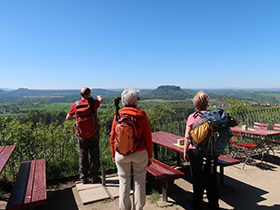 (lop) Der zweite Wandertag beginnt an einem recht kalten Morgen auf der Burg Hohnstein und geht erst einmal angenehm bergab auf breiten Waldwegen in Richtung Brand. Ein großartiger Ausblick über die weite Ebene vom Brandmassiv in das Polenztal mit einigen solitären Felsmassiven untermalt das erste Picknick.