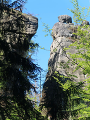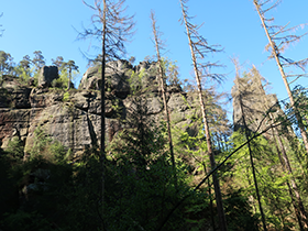 Die sonst so üppig mit ihren Pfunden wuchernde Natur sorgt auf dieser Etappe für etwas Ernüchterung: Die Trockenheit der letzten Jahre und der Borkenkäfer haben im sehr ursprünglichen Polenztal, in dem sogar Lachse und Fischotter wieder mit Erfolg angesiedelt worden sind, unter den Fichten furchtbar gewütet. Die Waldarbeiter sind hörbar beschäftigt. Wer den Blick fürs Detail schulen will, findet an den Felsrändern die Trichterfallen des Ameisen-Löwen im Sand, dem kein Insekt entkommt, das arglos die kleinen Kuhlen betritt.