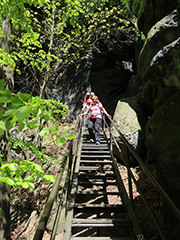 In Altendorf angekommen besteigt die Gruppe an der Haltestelle die historische Kirnitzschtalbahn und lässt sich gemütlich das letzte Stückchen nach Bad Schandau gondeln. Im Parkhotel direkt an der Elbe entschädigen Sauna und Pool für einen etwas anstrengenden Wandertag.