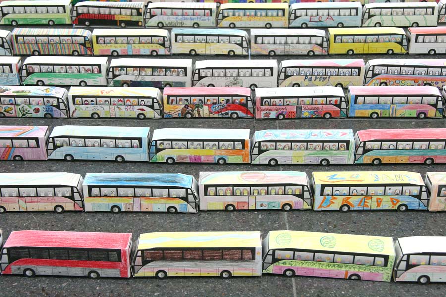 Eine 267 Meter lange bunte Schlange wurde auf der CMT in Stuttgart zum Blickfang: Der längste Konvoi bemalter Faltbusse der Welt erregte die Aufmerksamkeit der Messebesucher. Jeder einzelne der 1700 fantasievoll gestalteten Pappbusse ist ein Kunstwerk für sich. Als Kette hintereinander gereiht sind sie ein Gesamtkunstwerk der Superlative. Die Busse imponieren mit peppigen Slogans und poppigen Farben. Das Spektrum der Stile reicht von dezentem Realismus über explosiven Impressionismus bis zu experimentierfreudigem Surrealismus. „Vielleicht ist das ganze hier ein bustouristischer Individualismus“, überlegt Rainer Klink beim Blick auf den bunten Konvoi. „Aber dafür gibt es ja Kunstexperten“, stellt der Vorsitzende der Gütegemeinschaft Buskomfort (gbk) fest. Der Verband mit Sitz in Böblingen hat im Herbst über seine mehr als 500 Mitgliedsbetriebe Schulen in der ganzen Bundesrepublik mit 34 000 weißen Faltbussen versorgt. Die Schüler griffen zu Buntstiften, Wachskreide und Filzschreibern oder tauchten den Pinsel in Aquarellfarben. Manche klebten auch glänzende Perlen, glitzernde Folien oder bunte Federn auf die Karosserie. Kurz vor Weihnachten stapelten sich in der Geschäftstelle der gbk 1700 bunte Busse, die von den Teilnehmern des Gewinnspiels eingeschickt wurden. Jeder der Faltbusse ist 16 Zentimeter lang. Aneinander gereiht ergeben sie eine Schlange von 267 Metern. Klink: „Auch wenn wir den Eintrag in das Guinness-Buch der Rekorde noch nicht haben: Das ist der längste Konvoi bemalter Faltbusse der Welt!“ Am 17. Dezember wurden von einer Jury, zu der auch Eva Ott, Kunsterzieherin und Vorstandsmitglied im Galerieverein Leonberg gehört, die 20 schönsten ausgewählt. Die Künstler dieser Busse werden in ihren Klassen sicherlich zu kleinen Helden. Denn sie ermöglichen es, dass die gesamte Klasse im Jahr 2010 mit einem Mitgliedsunternehmen der gbk zu einem touristischen Ziel wie dem Europa-Park, dem Mathematikum Gießen oder den Bavaria Filmstudios fahren kann. Der Wettbewerb markiert einen Höhepunkt der Kampagne „Klasse fährt Klasse“, mit der die gbk Schüler, Eltern und Lehrer über die Kriterien für pädagogisch wertvolle Schulausflüge aufklärt. „Mit dieser Kampagne wollen wir Schülerinnen und Schüler für nachhaltigen Tourismus mit einem umweltfreundlichen Verkehrsmittel begeistern“, betont Rainer Klink. „Die überwältigende Resonanz auf unseren Malwettbewerb beweist, dass uns dies gelingt.“ Weitere Infos unter www.klassefährtklasse.de.
