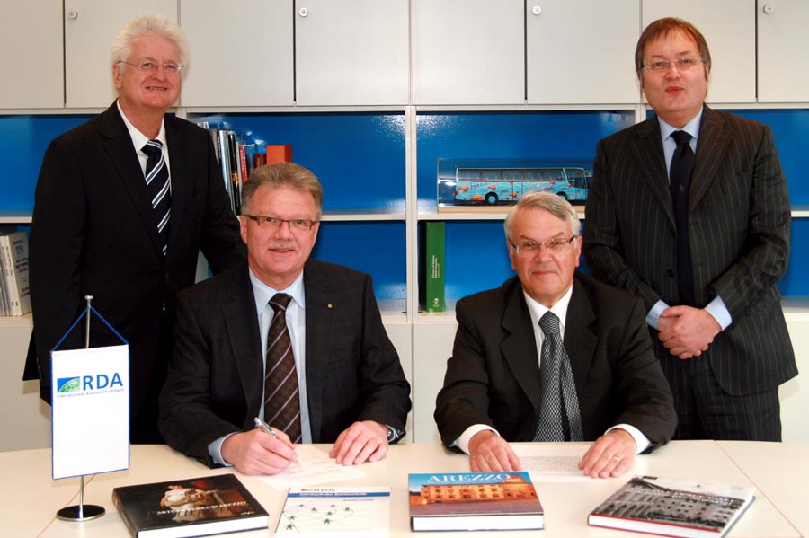 So eine Meldung hat Seltenheitswert: In Arezzo in der Toskana sind Busse hoch willkommen und werden sogar noch gefördert. Am 26. Januar 2010 unterzeichneten in der RDA-Geschäftsstelle in Köln Giuseppe Marconi, stellvertretender Bürgermeister der toskanischen Stadt Arezzo und RDA-Präsident Richard Eberhardt eine Vereinbarung, welche die Bustouristik in Arezzo langfristig fördern und unterstützen soll. Marco Montini, Direktor der Italienischen Zentrale für Tourismus ENIT, hat sich ebenfalls für dieses Abkommen stark gemacht. „Diese gemeinsam entwickelte Vereinbarung zur Förderung der Bustouristik nach Arezzo, hebt sich wohltuend von der Situation in anderen italienischen Städten ab“, führt Richard Eberhardt aus. So hat bspw. die Stadt Lucca zu Beginn des Jahres 2010 die Buseinfahrtsgebühr von bisher 36 Euro auf nun 80 Euro drastisch erhöht. Laut Vereinbarung zur Förderung der Bustouristik verpflichtet sich die Kommune von Arezzo, künftig von RDA-Mitgliedsunternehmen keine Gebühr oder Maut für die Einfahrt in das Stadtzentrum und die Region von Arezzo zu erheben. Ferner wird Arezzo ab sofort selbst oder in Zusammenarbeit mit den örtlichen Behörden einen Bonus für Kraftstoff in Höhe von 100 Euro pro Reisebus zahlen. Vorausgesetzt, dass RDA-Mitglied bleibt für mindestens zwei Übernachtungen mit den Gästen in der Region Arezzo. Der Bonus verdoppelt sich bei mindestens vier Nächten auf dann 200 Euro. Bei Werbeaktionen auf dem deutschen Markt wird Arezzo auf den Beitrag der Bustouristik zum touristischen Aufkommen hinweisen. Damit die Vereinbarung auch nachvollziehbar gelebt wird, verpflichtet sich Arezzo mit Einführung eines Qualitätssiegels die Qualität zu überwachen. Der RDA wird in die Verifikation des Siegels eingebunden. In Arezzo wird eine – mindestens englischsprachige, möglichst deutschsprachige – Stelle eingerichtet, die dieses Siegel überwacht und möglichen Reklamationen nachgeht. Der RDA wird im Rahmen seiner Möglichkeiten über Arezzo – die viertgrößte Stadt in der Toskana – als busfreundliches Reisegebiet aufklären. Im Rahmen von Partnerseminaren können beispielsweise die touristischen Leistungsträger in der Region Arezzo über die Optimierung der Zusammenarbeit mit Busunternehmern informiert werden. Arezzo wird sich aber auch in der Presse- und Öffentlichkeitsarbeit des RDA wiederfinden. Richard Eberhardt: „Italien ist für die Bustouristik ein wichtiges Ziel, um so mehr freue ich mich, dass wir nun mit Arezzo eine toskanische Perle anbieten können, bei denen unsere Mitglieder herzlich willkommen sind. Mit seinen Kaufmannspalästen, Patrizierhäusern und Sakralbauten ist Arezzo ein Juwel mittelalterlicher Architektur und Kultur und kann sich mit seinen zur Zeit noch berühmteren Nachbarn durchaus messen.“