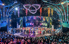 Vollbesetzt bis auf den letzten Platz mit 1900 Gästen, darunter zahlreiche Prominente aus Politik, Kultur und Gesellschaft feierte der Friedrichstadt-Palast Berlin auf der größten Theaterbühne der Welt die Weltpremiere seiner bisher teuersten Produktion. Zum Verbeugungsfinale gab es kein Halten und Cast und Ensemble wurden mit wahren Begeisterungsstürmen und langanhaltenden Standing Ovations gefeiert (Foto: Markus Nass). Hinter der neuen „Falling | In Love“-Grand Show steckt auch die geniale Handschrift des französischen Stardesigners Jean Paul Gaultier, der gemeinsam mit dem internationalen Kreativteam unter Leitung von Autor und Regisseur Oliver Hoppmann Berlins neues Show-Juwel erschuf.
