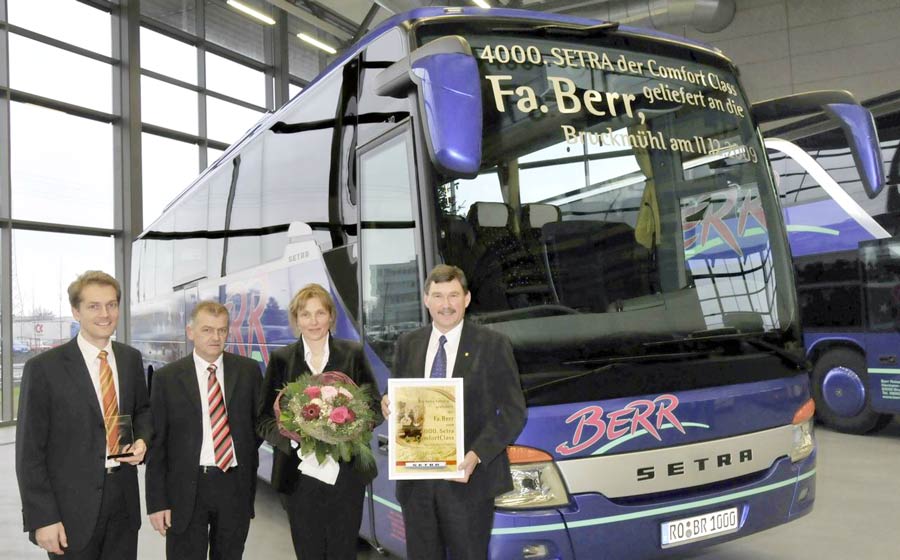 Die Auslieferung des 4 000sten Fahrzeugs der Setra ComfortClass 400 ist der aktuellste Beweis dafür, dass sich diese Baureihe wirtschaftlicher Reisebusse für den Reise- und Gelegenheitsverkehr in den sechs Jahren seit ihrer Markteinführung in Europa sehr erfolgreich entwickelt hat. In den letzten sechs Jahren ist das Produktprogramm auf insgesamt sieben zwei- und dreiachsige Typen angewachsen. Nun wurde das Jubiläumsfahrzeug im Setra KundenCenter in Neu-Ulm an das mittelständische Omnibusunternehmen Berr aus Bruckmühl im Landkreis Rosenheim (Oberbayern), zusammen mit einem Setra Doppelstockbus S 431 DT, übergeben. Die im Jahr 1996 von Hans Berr gegründete Firma investiert in ganz umfangreichem Maße in neue Omnibusse und den Ausbau des Reisebusunternehmens. Insgesamt wurden in den letzten Jahren 18 Setra Neufahrzeuge, davon 16 Setra Reisebusse, angeschafft. Außerdem wurde in Bruckmühl eine neue Omnibushalle und ein neuer Werkstattbetrieb gebaut.