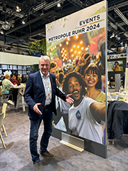 (coe) „Wir haben in diesem Jahr das erste Mal seit der Pandemie wieder einen eigenen Stand“, freut sich Andreas Wietheger (Foto oben) von RuhrTourismus. Der liebevoll eingerichtete NRW-Stand sei auch dazu gedacht, das Ambiente der Region zu vermitteln. „Das ist in den Gesprächen hilfreich“, so Wietheger. „Der Zeitpunkt der ITB ist wirklich gut um sowohl über neue, aktuelle Angebote für 2024, als auch über Angebote für 2025 zu sprechen.“