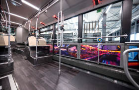 Mit den vielfältigen Gestaltungsmöglichkeiten, die der Citaro Baukasten in der Exterieur- und Interieur-Gestaltung bereitstellt, ist der Mercedes-Benz Bus die ideale Plattform für derartige Kreativlösungen. Im Innern hat Spillmann auf gedeckte Farben und edle Materialien gesetzt. Der dunkle Bodenbelag setzt sich kontrastreich zu den hellen, beigefarbenen Sitzen aus Composition Leder ab. Die Seitenwände sind mit stimmungsvollen Bildmotiven bedruckt.