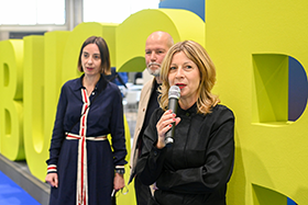 Kerstin Kube-Erkens (im Bild re.), Direktorin der Bus2Bus, stellt das Konzept der fünften Jubiläumsausgabe vor, inklusive Programm, Ausstellerstruktur und Formate.