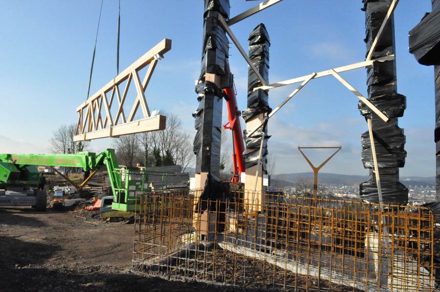 Hoch über der Stadt Koblenz mit einem weitschweifenden Blick auf Rhein und Mosel wurden die ersten zwei Bauteile des hölzernen Aussichtsbauwerks im Festungspark montiert. Das Mammut-Projekt wird in enger Zusammenarbeit von Landesforsten Rheinland-Pfalz und der BUGA Koblenz 2011 GmbH realisiert. Bei strahlend blauem Himmel wurden die ersten zwei Holzgitter des Aussichtsbauwerks verbaut, das einen Höhepunkt des BUGA-Ausstellungsbereiches „Festung Ehrenbreitstein“ darstellt. Hanspeter Faas, Geschäftsführer der BUGA Koblenz 2011 GmbH: „Das Aussichtsbauwerk verbindet den Festungspark visuell mit der herrlichen Landschaft des Oberen Mittelrheintals, in die die Bundesgartenschau Koblenz 2011 eingebettet ist. Die Besucher werden von den zwei Aussichtsebenen der Plattform einen herrlichen Blick genießen können.“ Das Besondere: Da die Spitze des dreieckigen Gebäudes über den Abhang hinaus ragt, stehen die Besucher quasi direkt im Rheintal – eine ungewöhnliche und zugleich atemberaubende Perspektive. Noch weitere vier der überdimensionierten Bauteile werden in den nächsten Wochen folgen. Zusammen bilden die sechs Teile dann die Seiten des Aussichtsbauwerks, von dessen dreieckigen Aussichtsplattformen aus sich ab dem Start der Bundesgartenschau Koblenz 2011 am 15. April das weitläufige Panorama des Mittelrheintals entfaltet.