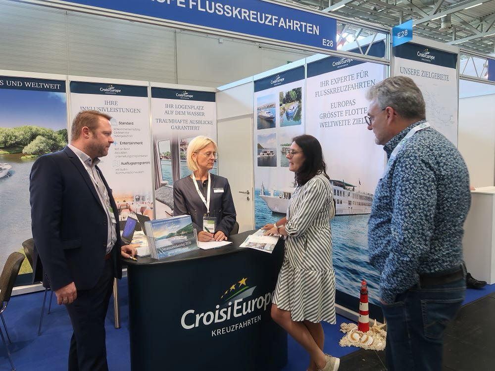 (lop) Auch das ist möglich: Mit Anton Götten Reisen, seit 30 Jahren Generalagent der Flusskreuzfahrt-Reederei CroisiEurope, geht es „auf Safari“ in Namibia und Botswana. Wie das funktioniert, erläutert Christian Kaatz, Managing Director des Saarbrücker Reiseveranstalters am Stand E28 bei der RDA Expo (auf dem Foto links, mit Birgit Iannone (M.) und Standbesuchern. c: lop).